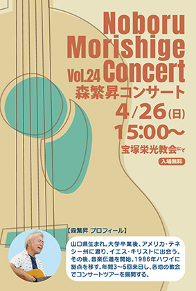【プロフィール】 山口県生まれ。1973年 米国に渡り、イエス・キリストに出会う。翌年、クリスチャンになる。 音楽を通してキリストの愛と救いを伝え始める。 1986年 ハワイに拠点を移す。 年間3~5回来日し、教会、道の駅、公園、通りなどで、ゴスペル(良い知らせ)を通して、永遠の希望を歌いながら各地を旅している。